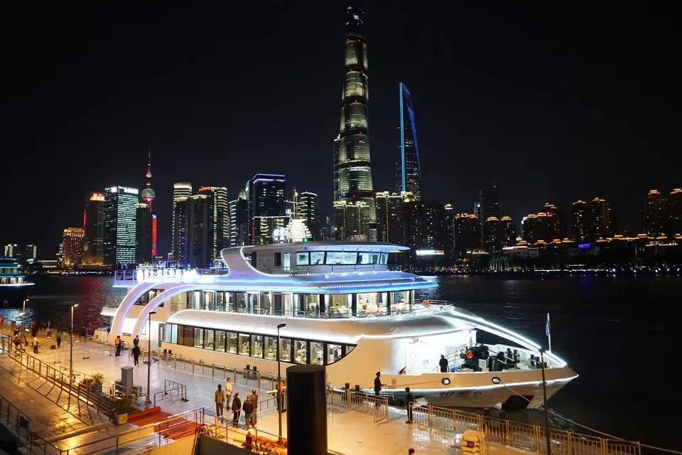 名信5号游轮:是上海黄浦江上一艘以通透设计和多功能用途著称的豪华游船,载客量为300人 ,常用于夜间观光、婚庆典礼、商务会议等各类水上活动。该船采用钢化玻璃船体结构,拥有近360度全透明玻璃墙设计,即便在天气不佳时也能无遮挡欣赏浦江两岸夜景。 主要特点与设施: 船体参数:总长36米,宽10.24米,总吨位488吨,吃水深度1.492米,适航于内河航道。 空间布局: 一层:无立柱设计,配备原木色桌椅与白色内饰,可容纳80–120人,适合宴会或会议; 二层:豪华贵宾舱,装饰典雅,可容纳约30人,凸显尊贵氛围; 三层:开放式阳光甲板,配有蓝色透明座椅,可容纳60–80人,是观景与摄影的理想区域。 配套设备:配备专业调音室、音响系统、投影仪、中央空调、吧台及VIP贵宾房,支持多媒体演示与现场演出。