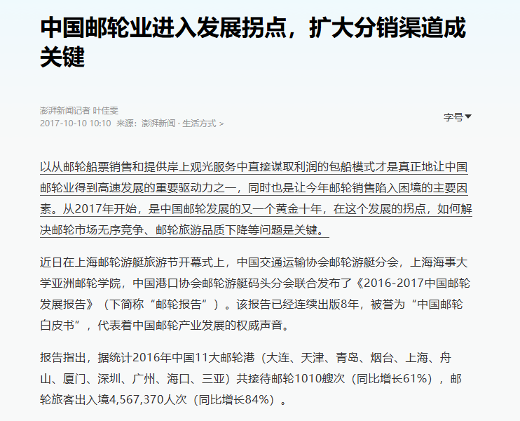 同时,未来数年,中国邮轮市场需要找回它作为全球第二大市场的议价权,而这需要的不仅是船,更是航线的重构与消费信心的重建。 |